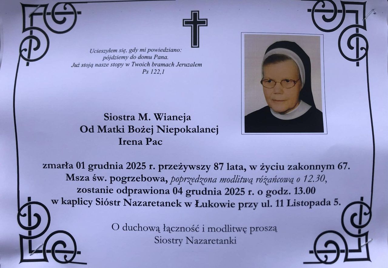 Siostry ze Zgromadzenia Sióstr Najświętszej Rodziny z Nazaretu w Łukowie zawiadamiają o śmierci siostry Marii Wianei od Matki Bożej Niepokalanej, Ireny Pac. Zmarła 1 grudnia. Uroczystości pogrzebowe odbędą się w czwartek, 4 grudnia.