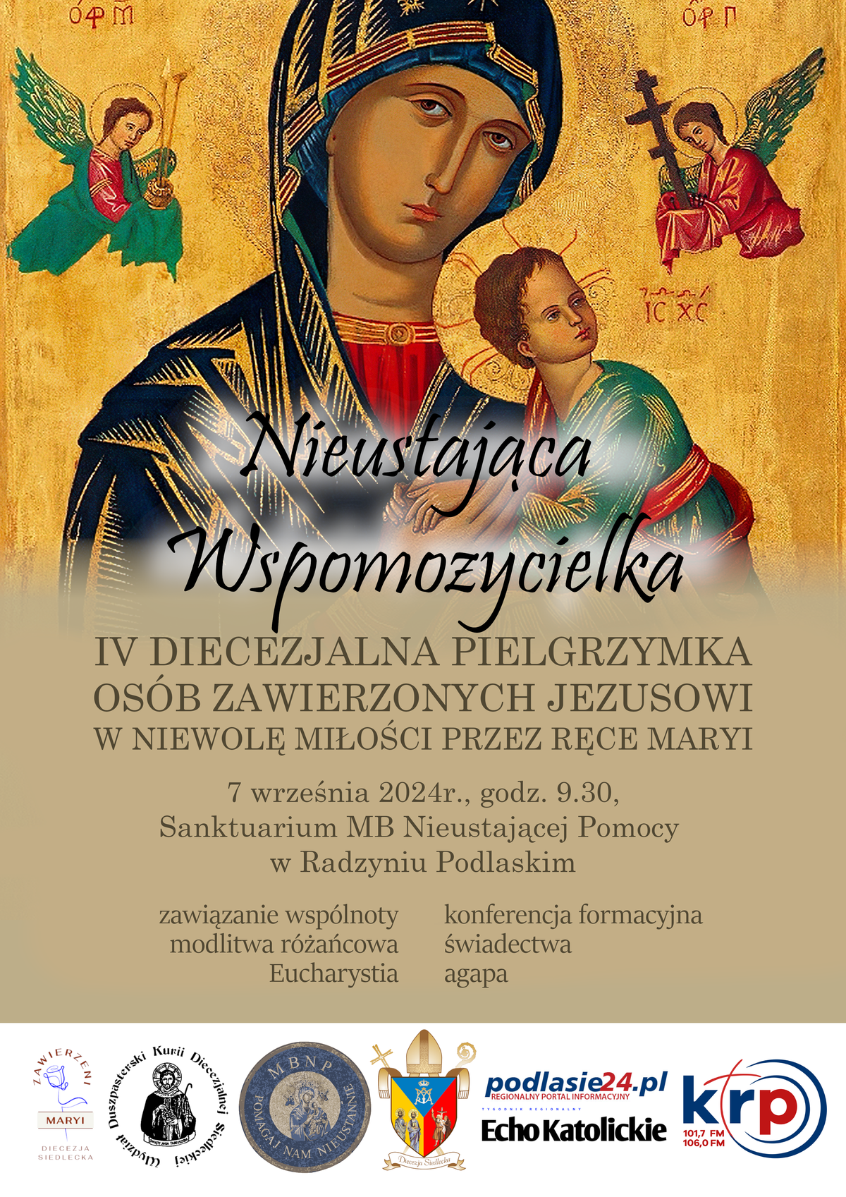 7 września, w pierwszą sobotę miesiąca, już po raz IV odbędzie się Diecezjalna Pielgrzymka Osób Zawierzonych Jezusowi w niewolę miłości przez ręce Maryi. Ks. Grzegorz Suwała, duszpasterz Wspólnoty Osób Zawierzonych diecezji siedleckiej informuje, że od tego roku pielgrzymka odbywać się będzie do miejsca, gdzie odprawiono pierwsze wspólnotowe, 33-dniowe Rekolekcje Zawierzenia w diecezji i gdzie znajdują się relikwie św. Ludwika Marii Grignion de Montforth, czyli do Sanktuarium Matki Boskiej Nieustającej Pomocy w Radzyniu Podlaskim.