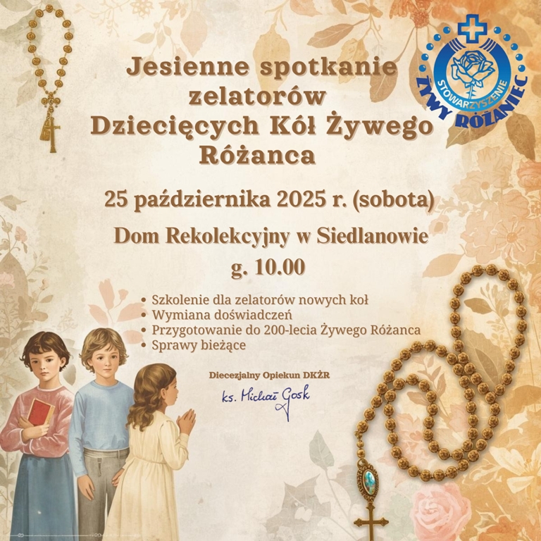 Zelatorzy oraz osoby zainteresowane prowadzeniem Dziecięcych i Młodzieżowych Kół Żywego Różańca w parafiach Diecezji Siedleckiej spotkają się na jesiennym szkoleniu formacyjnym w Domu Rekolekcyjnym w Siedlanowie. Inicjatywa ma na celu wsparcie już działających wspólnot oraz zachęcenie do zakładania nowych kół modlitewnych wśród dzieci i młodzieży.