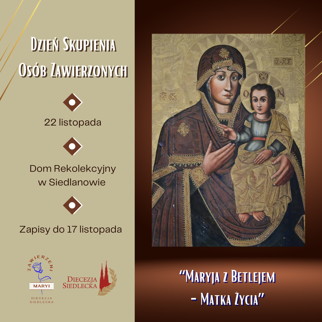 Zapraszamy na nie osoby chcące pogłębiać Drogę Zawierzenia w swoim codziennym życiu. Dzień Skupienia przebiegać będzie pod hasłem „Maryja z Betlejem - Matka Życia” i będzie wprowadzeniem w czas Adwentu. Uczestnicy zgłębią Boże Słowo wraz z Maryją, by od Niej uczyć się słuchania Boga i wypełniania Jego woli w swym życiu. Dniowi skupienia przewodniczyć będzie ks. Grzegorz Suwała, diecezjalny duszpasterz Osób Zawierzonych.Koszt udziału w spotkaniu to 80 złotych (obiad, kolacja, stały dostęp do kawiarenki i ofiara na dom rekolekcyjny). Liczba miejsc jest ograniczona, decyduje kolejność zgłoszeń. Zapisy trwają do 17 listopada pod numerem: 608 642 626.