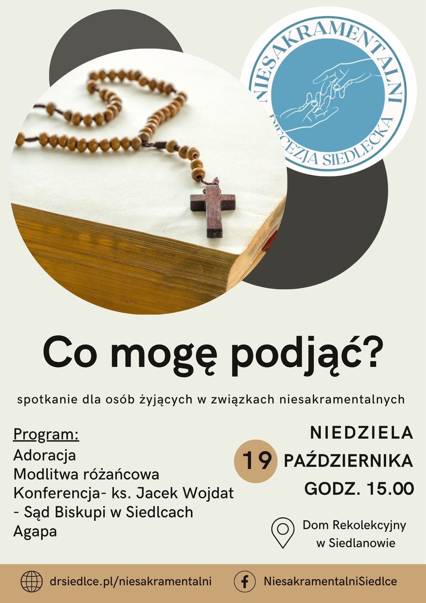 Spotkanie rozpocznie się Wystawieniem Najświętszego Sakramentu i modlitwą różańcową, po której konferencję wygłosi ks. Jacek Wojdat z Sądu Biskupiego w Siedlcach. Po części modlitewnej i formacyjnej zaplanowano agapę, czyli wspólne spotkanie przy stole. Będzie to również okazja do podsumowania Pielgrzymki Niesakramentalnych do Parczewa.Do udziału zaproszone są wszystkie osoby żyjące w związkach niesakramentalnych, które pragną pogłębiać swoją wiarę i budować wspólnotę.
