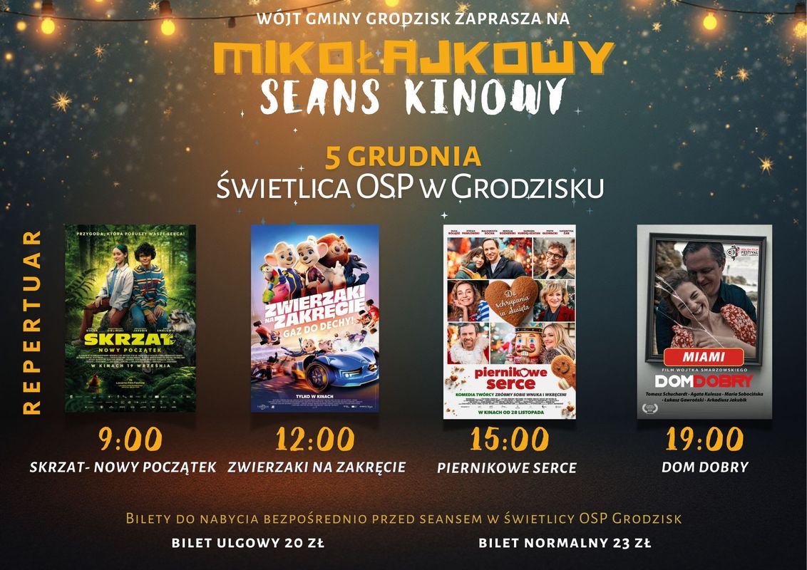 W piątek, 5 grudnia, świetlica OSP w Grodzisku zostanie przekształcona w salę kinową. W ciągu dnia odbędzie się kilka projekcji filmowych. Seanse dla dzieci i młodzieży o godz. 9:00 i 12:00 będą bezpłatne. Dorośli zostaną zaproszeni na pokazy o godz. 15:00 i 19:00.Repertuar: