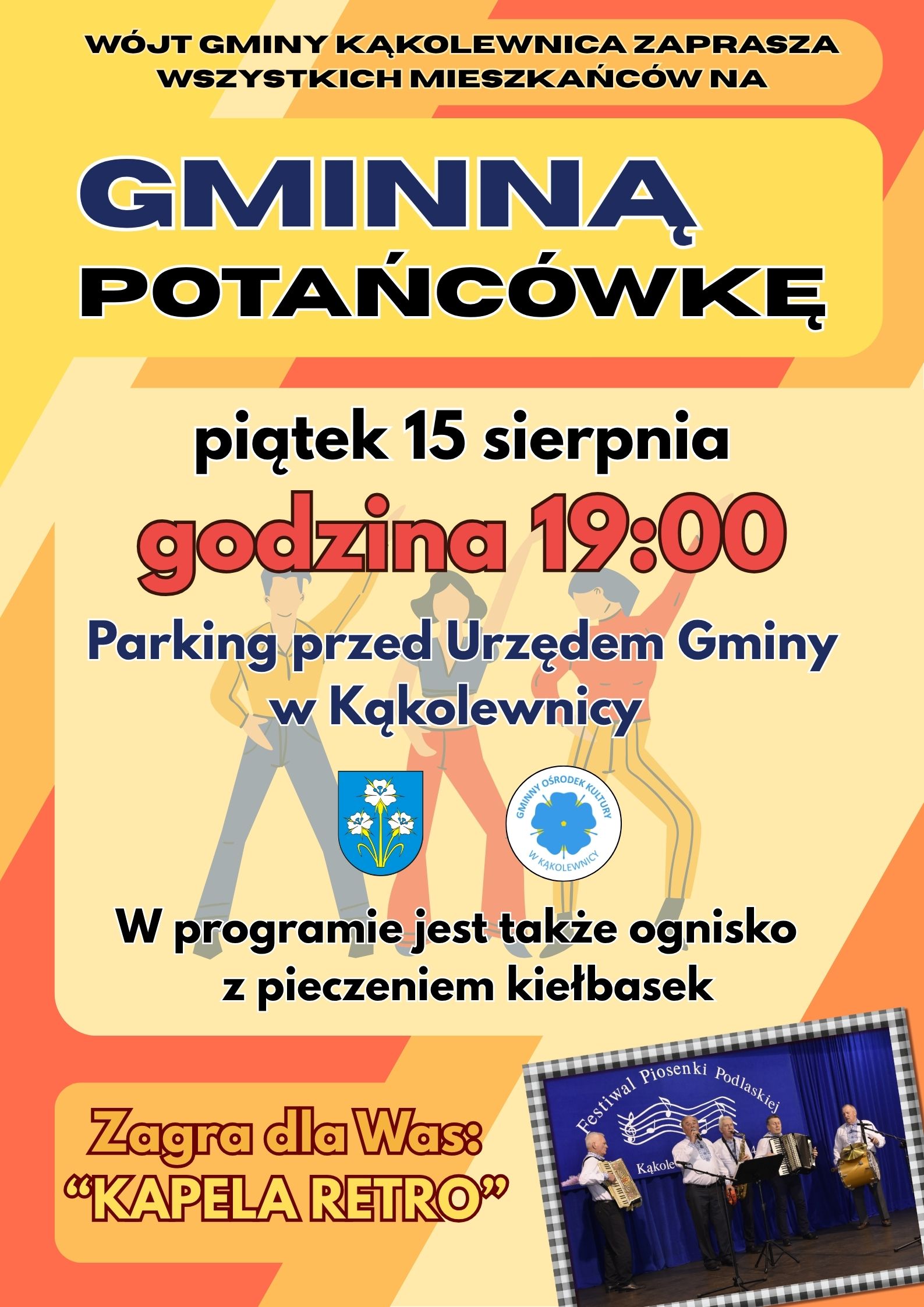 Gminna potańcówka odbędzie się na parkingu przed Urzędem Gminy w Kąkolewnicy. Zagra Kapela Retro. Potańcówka odbędzie się z inicjatywy Wójta Gminy Kąkolewnica w piątek 15 sierpnia. Rozpocznie się o godzinie 15:00.