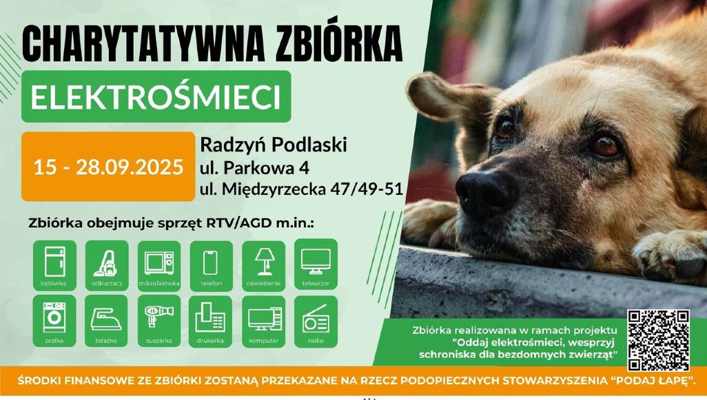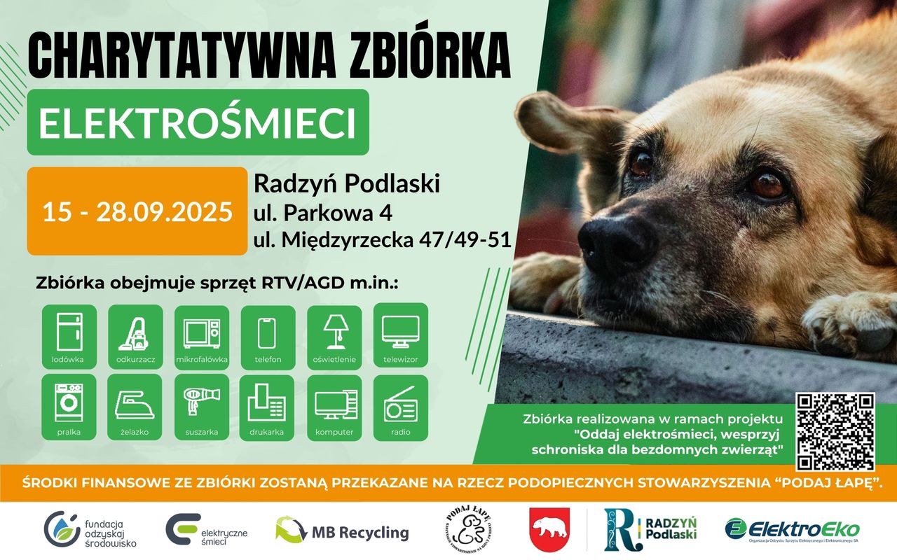 „Zbiórka dla podopiecznych Radzyńskiego Stowarzyszenia Na Rzecz Zwierząt „Podaj Łapę” to element ogólnopolskiego projektu pt. Oddaj elektrośmieci, wesprzyj schroniska dla bezdomnych zwierząt. Według raportu z maja ubiegłego roku, w Polsce w 2023 r. funkcjonowało 230 schronisk dla bezdomnych zwierząt, w których przebywało 81 778 psów i 35 391 kotów, a podstawowym wyzwaniem w utrzymaniu pozostają kwestie finansowe. Dlatego warto zrobić jesienne porządki i oddać zalegający, zużyty sprzęt elektryczny i elektroniczny w czasie zbiórki. W ten sposób chronimy siebie, swoich najbliższych i środowisko naturalne, ale także realnie pomagamy zwierzętom. Każdy kilogram elektrośmieci zamieniony zostanie na środki finansowe” - mówi Anna Podsiadło z ElektroEko Organizacji Odzysku Sprzętu Elektrycznego i Elektronicznego SA.