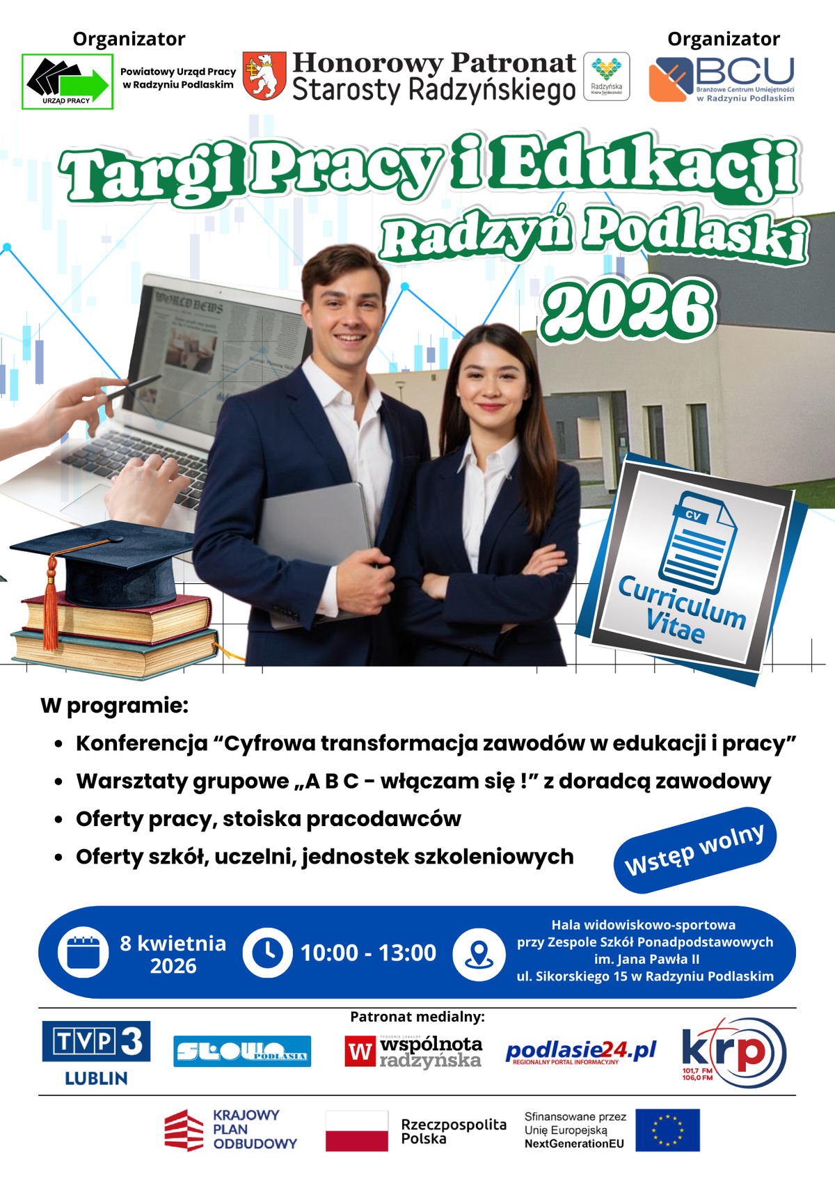 8 kwietnia w Radzyniu Podlaskim odbędą się Targi Pracy i Edukacji. Zaplanowano je w godzinach 10:00–13:00 w Hali Widowiskowo-Sportowej przy Zespole Szkół Ponadpodstawowych im. Jana Pawła II przy ul. Sikorskiego 15. Organizatorami targów są Powiatowy Urząd Pracy w Radzyniu Podlaskim oraz Branżowe Centrum Umiejętności w dziedzinie zawodowej elektryka.