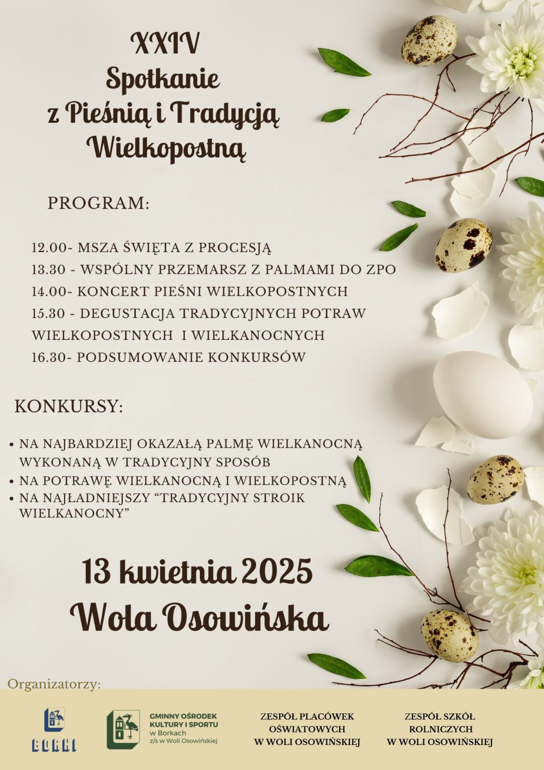 Trwa Wielki Post. Tegoroczne Święta Wielkanocne odbędą się w dniach 20–21 kwietnia. 13 kwietnia, w Niedzielę Palmową, w Woli Osowińskiej odbędzie się Spotkanie z Pieśnią i Tradycją Wielkopostną. Wydarzenie rozpocznie się w samo południe Mszą świętą w miejscowym kościele parafialnym.